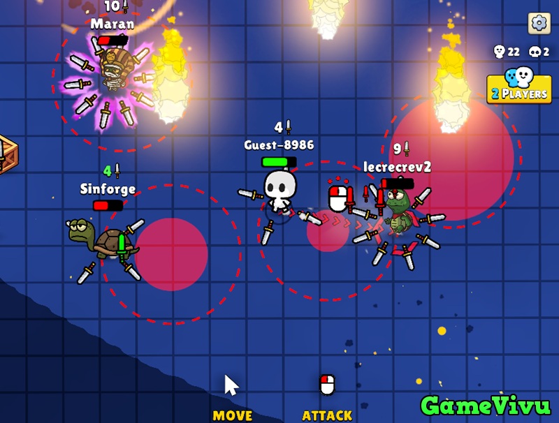 Càng thu thập được nhiều kiếm, sức mạnh và tầm tấn công của bạn càng lớn. Tuy nhiên, đấu trường sẽ dần thu hẹp lại theo thời gian, cùng với những cơn mưa lửa nguy hiểm buộc bạn phải liên tục di chuyển để sinh tồn.