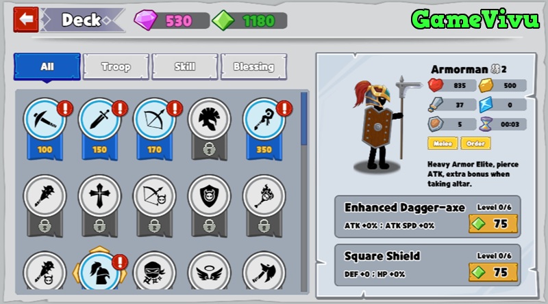 – Hệ thống nâng cấp sức mạnh, giáp và kỹ năng cho quân đội.