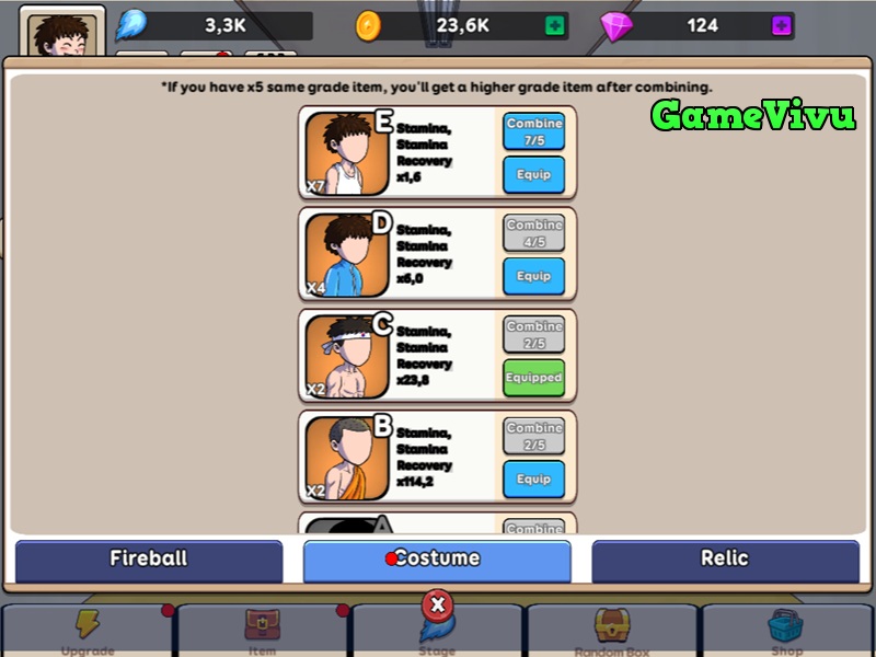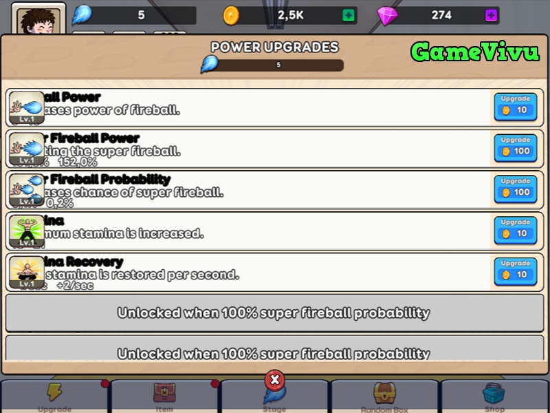 Dùng số tiền bạn có để nâng cấp quả cầu lửa và kỹ năng cho nhân vật