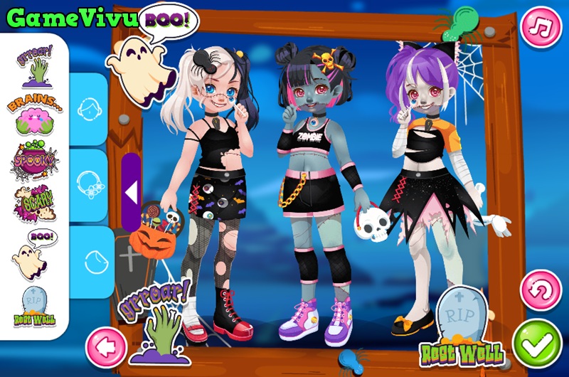 Nhiệm vụ: Giúp ba cô bé chọn trang phục, kiểu tóc và phụ kiện để tạo nên phong cách zombie thật ấn tượng.